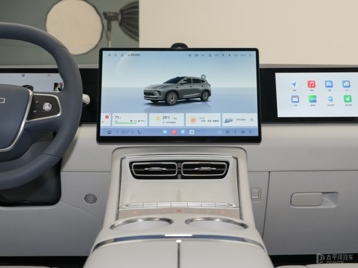 内部配有三款屏幕,尺寸分别为10.25全液晶仪表盘+15.6悬浮式中控屏+12.3英寸副驾娱乐屏,支持三指跨屏拖拽。其次搭载高通8255芯片,配备 AI 大模型(无网络可交互),支持全能手机互联。悬浮式中控屏下方配有空调出风口和手机无线充电面板。另外悬浮式中控屏上方还有圆形电子表设计。车内搭载双辐式方向盘,其次门板和中控台都有氛围灯设计。