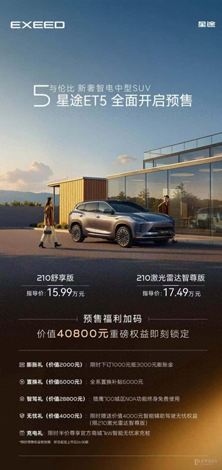 星途ET5预售价格 车型 预售价(万元) 210舒享版 15.99 210激光雷达智尊版 17.49